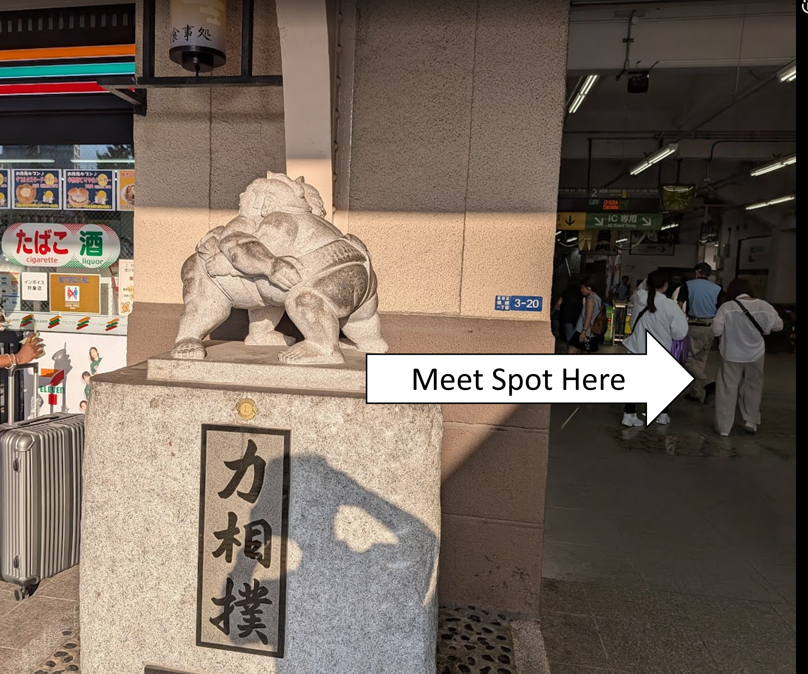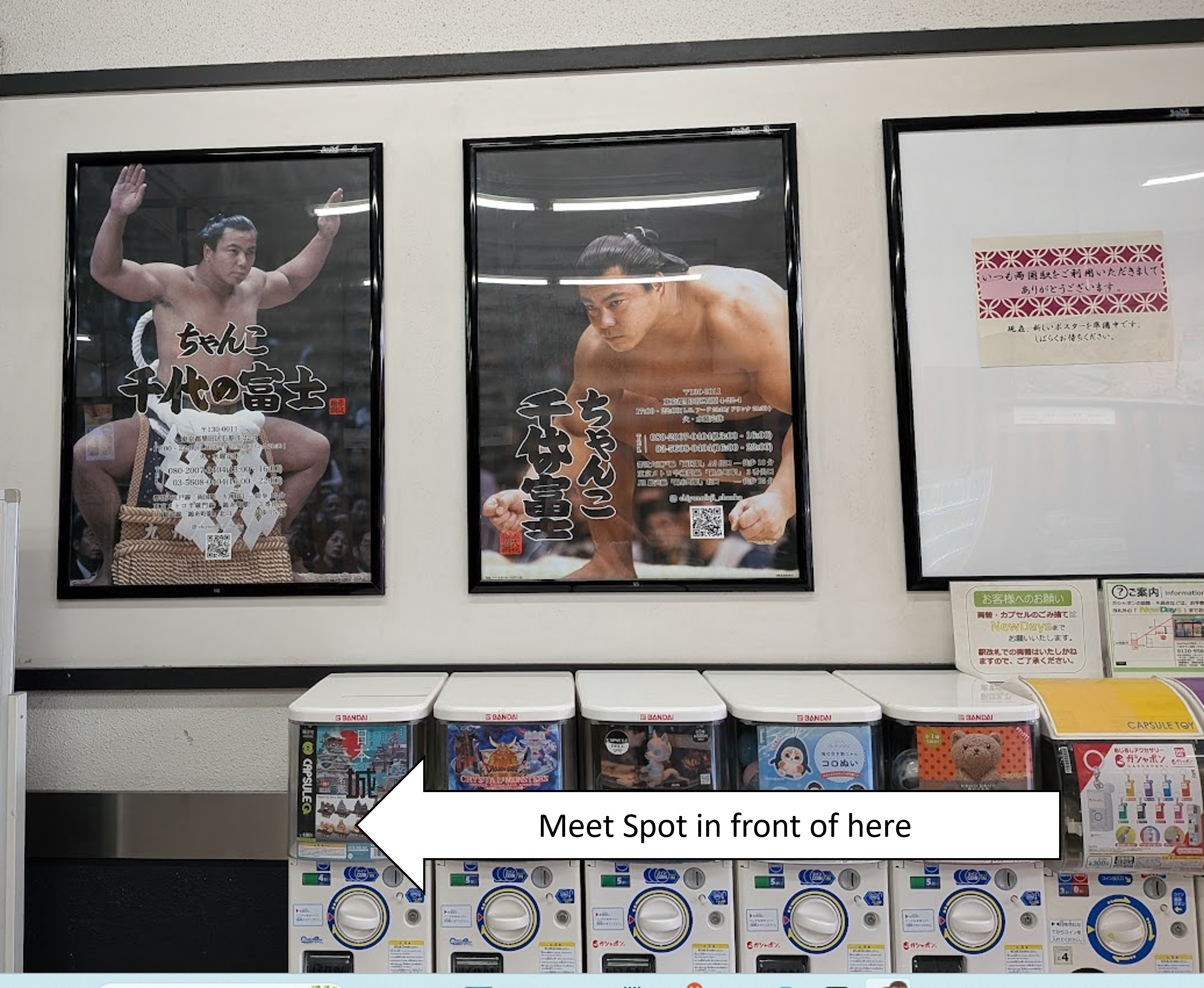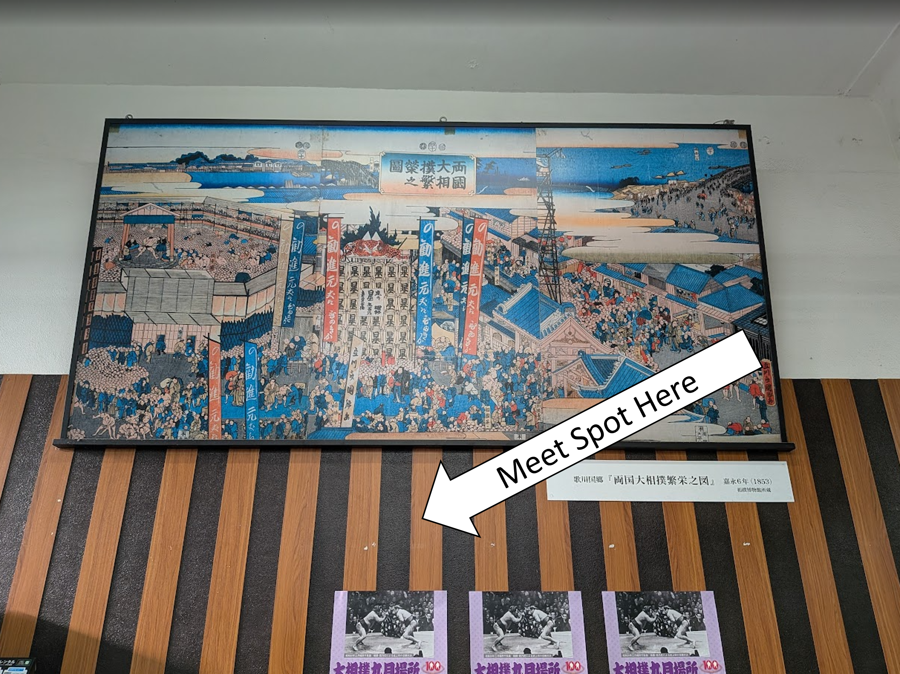 JR両国駅の西口の改札外です。大きな浮世絵パネル2枚が掲げられている付近です。
